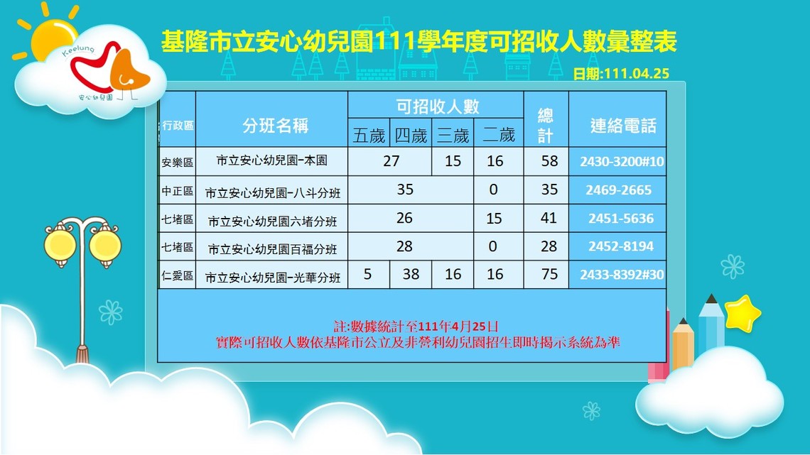 基隆市立安心幼兒園111學年度可招收人數彙整表